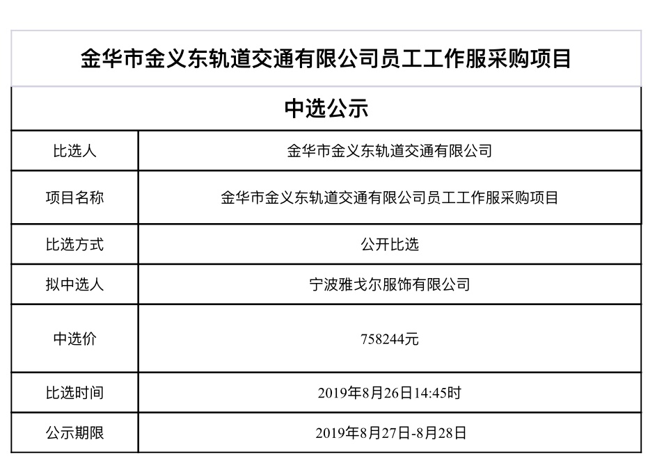 金華市軌道交通控股集團(tuán)物業(yè)管理服務(wù)有限公司2025-2026年度勞務(wù)派遣人員工作服采購項目中標(biāo)候選人公示