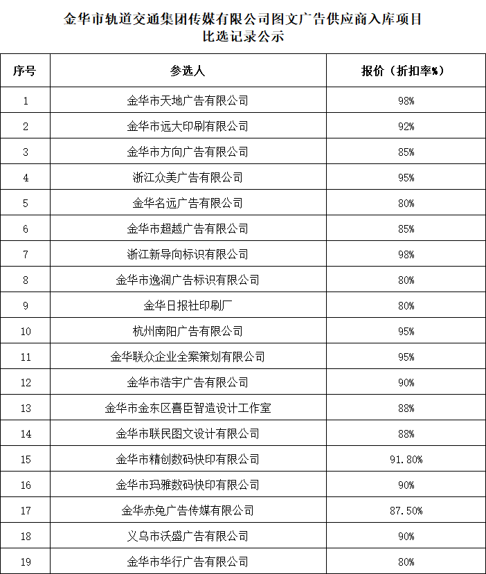 金華市軌道交通集團(tuán)傳媒有限公司圖文廣告供應(yīng)商入庫(kù)項(xiàng)目比選記錄、中選公示