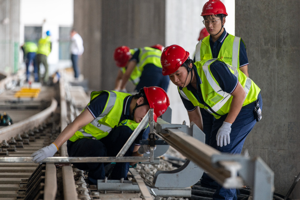 6月11日,在浙江省金華市金義東市域軌道交通工程塘雅車輛段,青年職工選手在參加軌道交通更換鋼軌接頭夾板項(xiàng)目技能比武。